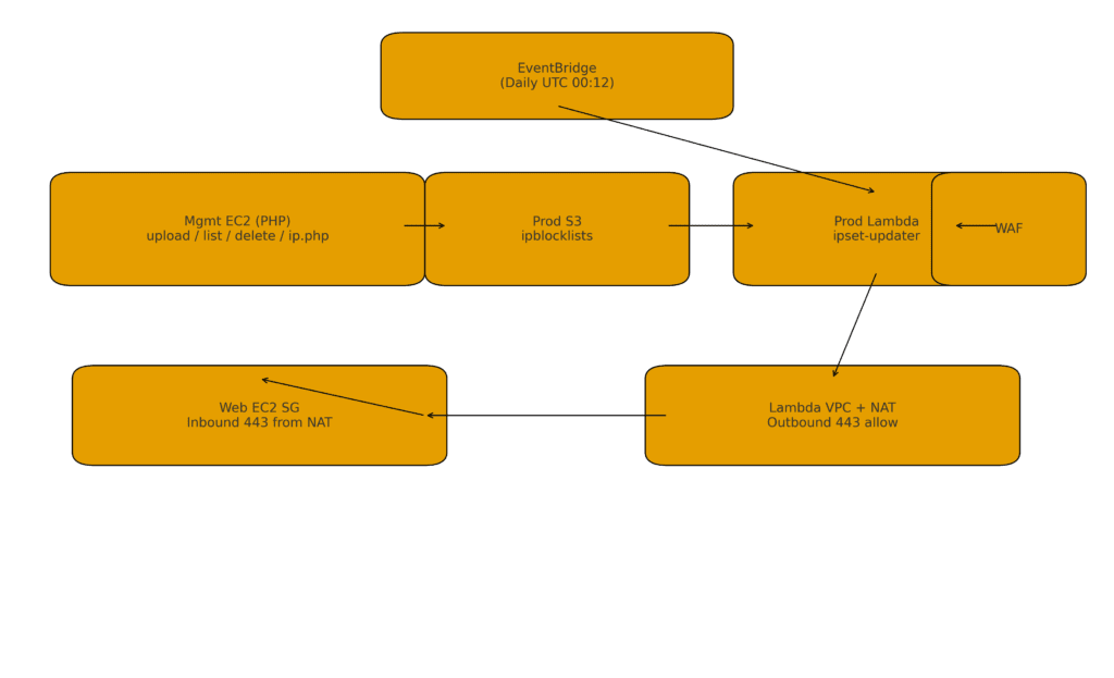 • EventBridge (daily)Lambda → fetch ip.php aggregated output (within last 90 days) → Update WAF IP set again