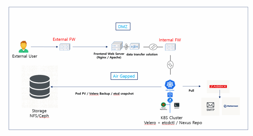 The following design illustrates a practical Kubernetes cluster architecture applicable to real-world air-gapped environments.