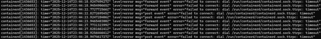 • 현상: containerd 프로세스는 살아있으나 내부 통신 프로토콜인 ttrpc가 타임아웃 되며 응답 불가(Hang) 상태에 빠졌다.