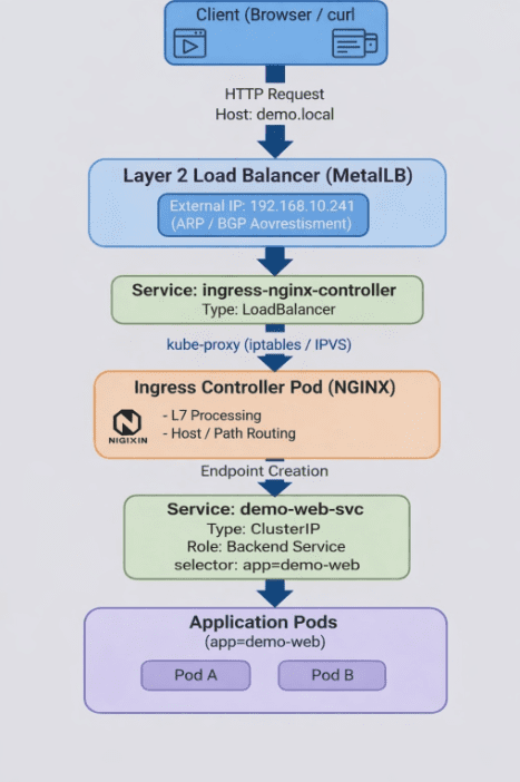 Ingress + MetalLB 전체 트래픽 흐름을 하나의 개념도로 정리한다.