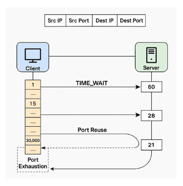Once all ports are occupied — typically by sockets in TIME_WAIT —
