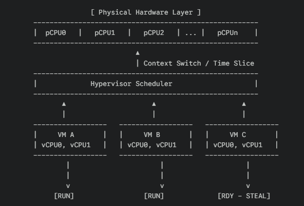 - Steal: The VM itself is not receiving CPU time because the hypervisor prioritizes other VMs.