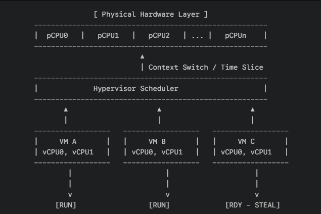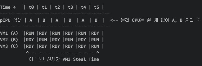 CPU 리소스가 부족할 때 VM이 “Runnable(실행 대기)” 상태로 밀리면서 누적되는 지연이 바로 Steal이다.