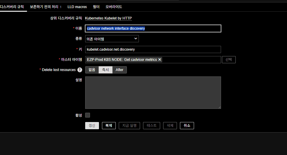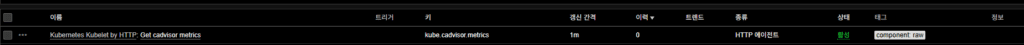 Kubernetes Kubelet by HTTP: Get cadvisor metrics를 마스터 아이템으로 지정.- 모든 Discovery와 아이템 프로토타입은 이 데이터를 기반으로 동작.