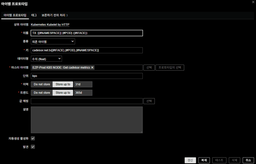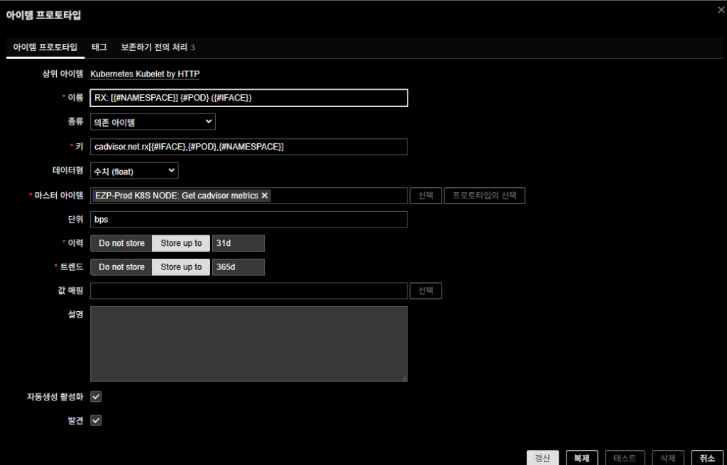 HTTP agent→ 마스터 아이템 → Discovery(LDD) → 아이템 프로토타입 → 전처리 체인 - 최종 목표: Pod/Namespace/Interface 단위 RX, TX 트래픽(bps)