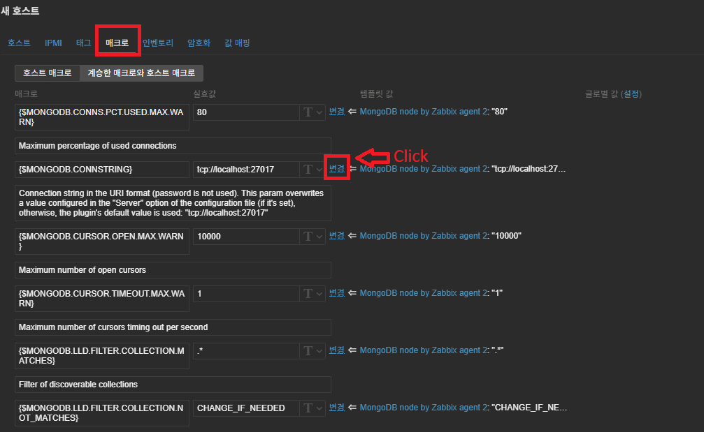 In the Zabbix Web UI, macros can be left empty or kept as defaults.